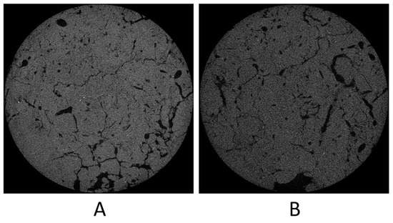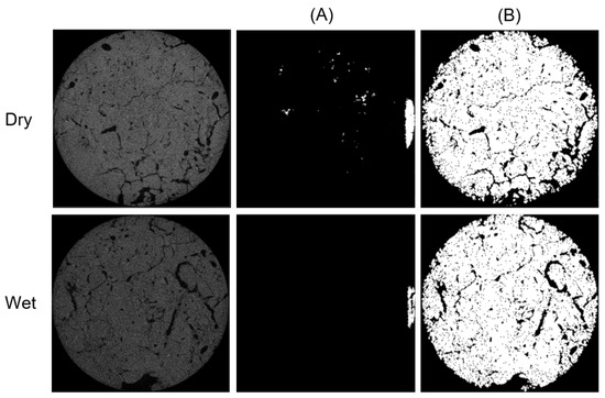 The Silty Loam Phaeozem Albic (SLPA) dataset [2] contains two varieties of sample conditions: dry and wet (Figure 6). After the first microtomography in dry condition, the sample was removed and moistened by the excess water through the base of several filter papers. This moistening process continued for 7 full days. Then, the sample was free-drained on a sandy base, reaching constant weight without evaporation. Then, the sample was imaged by microtomograph for 2–3 h. Both volumes have 1001 slices with dimensions . The ground truth, however, was not made available. In the experiment carried out with this dataset, the masks were generated automatically by the proposed method.