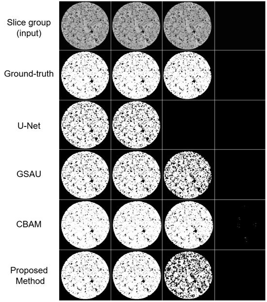 However, in addition to the proposed method slightly outperforming CBAM, its qualitative results were also better. Figure 7 shows the qualitative results of the tested methods. In that figure, the last slice group is shown. For all the tested methods, segmentation errors were observed in the last slice group.
