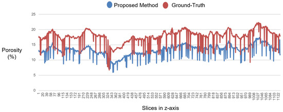 At last, Figure 8 shows a comparison of the porosity curves estimated by the proposed method and by ground-truth. Despite the difference between the porosity averages, the behavior of the curves is very similar. This shows that the method has achieved promising results, as it provides an analysis comparable to the real scenario.