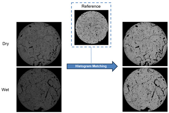 After this pre-processing, the proposed method was applied to the dry and wet samples. These samples then passed through the slice group splitting, segmentation, and slice group merging stages, thus obtaining the segmented volumes. Figure 10 shows the difference between the segmentations obtained with and without histogram matching. Notably, applying this technique was a determining factor in achieving better results. From the masks generated, the following properties were calculated: porosity, tortuosity, and porosity curve. The results for the first two can be seen in Table 4.