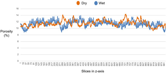 This is also confirmed by comparing the porosity curves, as shown in Figure 11. The drastic reduction in porosity can be seen at various points on the chart. The maximum porosity value observed in the dry sample was 14.38%. In the wet sample, this same slice showed 11.23%. Regarding the lowest porosity values observed, the dry sample had a minimum of 9.23% while the wet sample had 8.82%.