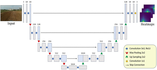 Our methodology employed the U-Net architecture [18] to detect tillage boundary points based on heatmap regression, specifically utilizing three key points within the tillage field. This approach allows for the precise detection of tillage boundaries by creating detailed heatmaps around the tillage boundary points. These heatmaps serve as a normalized Gaussian distribution with a variance parameter of five, and in the final heatmap output, the highest intensity value within each channel indicates the location of these landmarks. By utilizing the maximum value within the heatmap to determine the boundary points, our model ensured an accurate representation of the tillage boundaries. The U-Net architecture (Figure 4) is structured around a series of repeating modules.