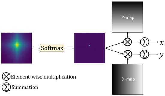 Initially, the softmax function was applied to the heatmap to convert the intensity values into a probability distribution, which transformed the raw intensity values into a probability distribution, highlighting the region most likely to contain a boundary point while deactivating the less likely areas. This probability distribution was then multiplied element-wise using two coordinate maps: the X- and Y-maps. The final step involved summing these weighted coordinates across the entire map to calculate the x- and y-coordinates.