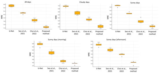 Box plots of MREs for different methods under various weather conditions. The MRE scores were obtained from five different training sessions. The methods compared are U-Net, Seo et al., 2021 [20], Choi et al., 2022 [25], and the proposed method. The weather conditions include all days, sunny days, cloudy days, sunny days (morning), and sunny days (afternoon). The dots in the box plots represent outliers, which are data points that fall outside the typical range of the distribution.
