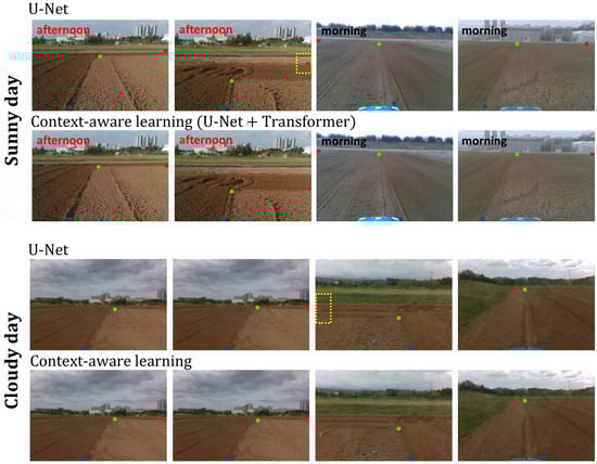 Visual comparison of tillage boundary detection under different lighting conditions using the basic heatmap regression (U-Net) and context-aware learning. Yellow dashed boxes indicate localization errors.