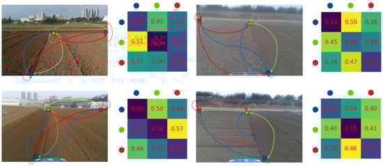 Each image has distinct tillage boundary points marked by blue-, green-, and red-colored dots for the first, second, and third points, respectively. These points were strategically placed to represent a significant area for accurately guiding agricultural machinery. The provided image collage compares the results of basic heatmap regression using U-Net versus a context-aware learning approach that integrates U-Net with a transformer under different weather conditions. On sunny days, inaccuracies in tillage point detection were visible in the vanilla heatmap regression approach, as indicated by the yellow dashed boxes. However, the context-aware learning approach of combining U-Net with a transformer significantly improved the results. Similarly, on cloudy days, basic heatmap regression struggled with mislocalization, whereas the context-aware learning method demonstrated enhanced results and robustness against varying environmental conditions. Figure 9 illustrates the self-attention matrices of the trained transformer model, specifically visualizing the relationships among three boundary points. Each subplot comprises an image and a corresponding attention matrix. In the images, lines connect the three points, and the thickness of the lines represents the attention scores. Thicker lines denote higher attention scores, indicating stronger attention or relevance between the points. The matrices on the right display attention scores in red. These scores quantify the importance of each boundary point in the context of the others, as learned by the transformer model. Our findings indicate that boundary points exhibit uniformly low attention scores when they reference themselves, and tend to allocate more focus to other points. In addition, no noticeable changes in the patterns of the attention score metrics were observed with variations in the environment or amount of training data.