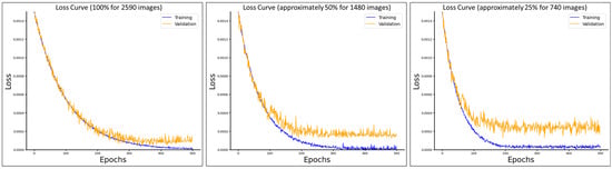 Figure 10 illustrates the loss curves for the training and validation datasets using 100%, 50%, and 25% of the available images. The loss curves show that the model performance declined as the amount of training data decreased. With the full dataset (2590 images), both the training and validation losses decreased steadily, indicating good generalization. With half of the data (1480 images), the validation loss fluctuated more and was higher, indicating reduced generalization. Using only 25% of the dataset (740 images), the validation loss became more erratic but stabilized after early epochs without overfitting.