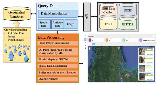 This research focuses on developing an application to assess the impact of flooding on oil palm harvesting in oil palm plantations by leveraging geographic information systems (GIS) and deep learning techniques. The research framework is illustrated in Figure 1. The application incorporates a spatial database that enables querying of various types of data, including attribute data, spatial data, and digital images, which are retrieved via an Application Programming Interface (API) from service provider databases. The service providers include the GEE Data Catalog, ESRI, and USGS, which offer global geographic information services, as well as GISTDA, an agency specializing in geographic information services in Thailand. Furthermore, the application supports crowdsourced data collection from citizens and officials in flood-affected areas. It processes and integrates data through various modules and functions designed to handle both crowdsourced and service provider data. The key functionalities for processing and displaying data include Flood Image Classification, Oil Palm Fresh Fruit Bunch Classification, Flooded Map Generation from GISTDA/Satellite Classification, Spatial Data Comparison, Buffer Analysis based on the user’s location, and Overlay Analysis. These functionalities are displayed through a dashboard within the application. The study area and the research methodology for each component of the application are detailed in Section 3.1, Section 3.2, Section 3.3, Section 3.4, Section 3.5, Section 3.6 and Section 3.7.