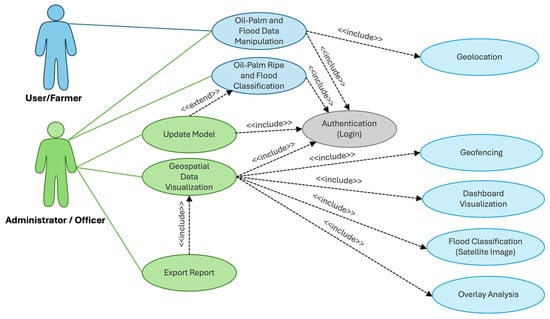 This research focuses on the analysis, design, and development of an application for inspecting oil palm plantations or gardens affected by floods. The results of the analysis and application design are presented in the use case diagram shown in Figure 3. The case diagram categorizes users into two groups: User/Farmer and Administrator/Officer. The first group consists of general users and farmers in the respective areas, while the second group comprises administrators and officers responsible for monitoring and inspecting flood-affected areas. The application assigns distinct roles and permissions to these user groups. General users or farmers can use the application to manage or add information about oil palm plantations, including images of flood occurrences and the ripeness of oil palm bunches on trees. The application retrieves plantation or garden coordinates via the GPS functionality in farmers’ smartphones. To add information, farmers must authenticate their identity within the system. Additionally, they can view information about oil palm plantations affected by floods. Administrators and officers, in addition to having the same capabilities as general users and farmers, can perform additional tasks such as uploading or updating models for classifying images of oil palm bunch ripeness and improving models for classifying flooded oil palm plantations. These functionalities facilitate the examination of the impact of floods on oil palm harvesting. The application also enables the analysis and display of spatial data, including information provided by farmers or the public, digital photograph classification for ripeness and flood occurrences, satellite image classification for flood areas, and overlay analysis to confirm flood occurrences. Data are displayed via a dashboard interface for enhanced visualization and decision-making.