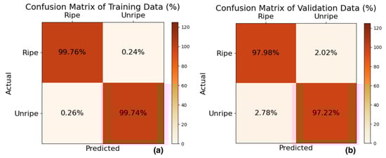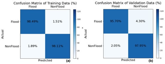 The classification results are further presented using confusion matrices. Figure 5a displays the confusion matrix for the training dataset, while Figure 5b shows the results for the validation dataset. For the training dataset, the classification accuracy for the Flood class was 98.49%, and for the Non-Flood class, it was 98.11%, indicating a high level of accuracy. For the validation dataset, the classification accuracy for the Flood class was 95.70%, while for the Non-Flood class, it was 97.95%, both of which reflect high accuracy levels. However, when comparing the validation results to those of the training dataset, a decrease in accuracy of approximately 1–3% was observed, particularly for the Flood class. Analysis of the misclassified Flood class images revealed that unclear water visibility and nighttime images contributed to classification errors. Despite these challenges, the proposed method, with accuracy values ranging between 95.70% and 98.49%, demonstrates robust performance. These results support the feasibility of using the model to develop an application for monitoring the impact of floods on oil palm plantations, in conjunction with a model for classifying the ripeness of oil palm bunches on trees.