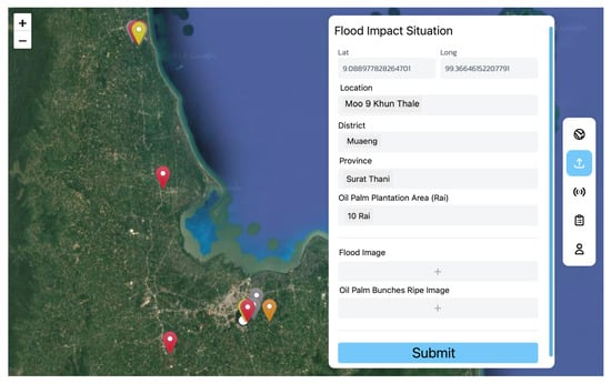 Regarding automatic image acquisition, the current application does not yet incorporate sensor-based or fixed-camera systems for autonomous image detection and uploading. The primary reason for this limitation is the cost and feasibility of installing and maintaining such equipment in large-scale agricultural fields. However, the system has been designed with scalability in mind, allowing for potential future integration with IoT devices or drone-based imaging solutions to enable real-time data collection and monitoring. Therefore, in this study, most oil palm image data during floods were obtained through manual user uploads, ensuring high accuracy and real-time data collection. At the same time, satellite imagery serves as a complementary tool to enhance the verification and overall assessment of flooded plantation areas.