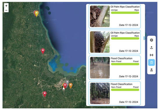The module for displaying data related to oil palm plantations that have reported or added information on the impact of floods is illustrated in Figure 8. This functionality is accessible to all user groups. The module features an online map interface with markers in various colors—gray, yellow, orange, and red—to represent the classification results for flood occurrence and the ripeness of oil palm bunches on trees. Specifically, gray markers indicate Non-Flood Unripe, yellow markers indicate Flooded Unripe, orange markers indicate Non-Flood Ripe, and red markers indicate Flooded Ripe. In addition to the map, the display includes images showing the classification results for the ripeness of oil palm bunches and the occurrence of floods in plantations or gardens. A color bar further visualizes the classification outcomes: a green bar indicates Ripe or Flood, while a gray bar indicates Unripe or Non-Flood. The module also allows users to filter data based on a specified time period, providing a customizable view of the information. This functionality enhances the application’s usability by offering clear and intuitive visualizations for monitoring the impact of floods on oil palm plantations.