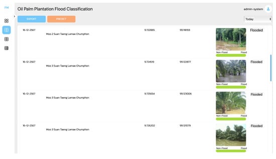 The module for classifying oil palm plantations or plots affected by floods is illustrated in Figure 9. This module classifies digital images containing information reported by farmers or officers. Administrators or officers can initiate the classification process within the application by clicking the “PREDICT” button. All unclassified flood image data stored in the database are processed using the model developed in this research. The classification results are displayed in the application and include details such as the notification date, location, latitude, longitude, and a color bar accompanied by text indicating the classification outcome. For example, a green bar and the text “Flooded” indicate a flooded area. The results in Figure 9 exemplify the classification of flooded areas. Visual assessment confirms that all displayed images correspond to actual flooded oil palm plantations.