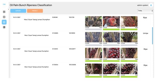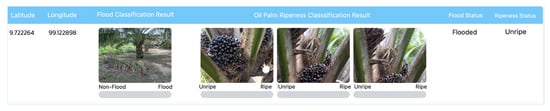 To assess the impact on oil palm harvesting, this module works in conjunction with the report generation module, integrating the classification results of oil palm bunch ripeness. The module for classifying oil palm bunch ripeness on trees is shown in Figure 10. This module is designed to classify photographs of oil palm bunches on trees, distinguishing between ripe and unripe bunches based on data reported by the public or farmers. Administrators can initiate the classification process by clicking the “PREDICT” button, prompting the application to retrieve unclassified oil palm bunch data from the database and classify it using the model presented in this research. The classification results include details such as the date, location, username, latitude, longitude, and the classification outcome. These outcomes are displayed as images with color bars—gray indicating “Unripe” and green indicating “Ripe”—accompanied by a textual summary of the classification results. Figure 10 provides an example of the classification outcomes, including both Ripe and Unripe classes. For each plantation, three images of oil palm bunches on individual trees are analyzed. The final classification for a plantation is determined by the majority class among the three images. For example, if two out of three images are classified as “Ripe”, the plantation is categorized as “Ripe”. The classification results for oil palm bunch ripeness are integrated with the flood classification results in the report generation module. These combined results are processed and displayed on a dashboard, utilizing flood area data derived from satellite image processing for comprehensive analysis and visualization.