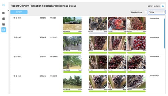 To assess the impact of floods on oil palm plantations during harvest periods, administrators or officers can utilize the application’s report module, as illustrated in Figure 11, Figure 12, Figure 13 and Figure 14. This module processes and displays classification results from digital images, including both flood occurrence and the ripeness of oil palm bunches on trees. Figure 11 presents data on oil palm plantations or plots affected by harvest disruptions due to flooding. The results are displayed in both image and text formats, with the text indicating “Flooded-Ripe”. The module allows administrators or officers to filter data based on specific criteria and time periods. Available time period options include Today, 7 Days, and All. Figure 12 shows data on oil palm plantations or plots affected by flooding where the oil palm bunches on the trees are unripe. In such cases, flooding does not impact harvesting, as the products are not yet ready for collection. Similarly, Figure 13 and Figure 14 display data on oil palm plantations that are not affected by flooding. Whether the oil palm bunches are ripe or unripe, the absence of flooding ensures that harvesting is not disrupted. Additionally, the report module supports data export in MS Excel format, enabling the information to be utilized for planning budget allocations to assist affected farmers. These data can also be used for future budget planning and to devise strategies for flood mitigation and monitoring in affected areas.