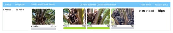The study results demonstrate that the proposed application and methodology accurately assess flood-affected areas in oil palm plantations, achieving high accuracy in both flood classification and oil palm bunch ripeness classification. The flood classification accuracy ranged from 96.80% to 98.29%, while the classification of oil palm bunch ripeness on trees achieved an accuracy of between 97.60% and 99.75%. A comparison with previous studies revealed consistency in findings, particularly regarding the use of satellite and digital images for monitoring flood occurrences and impacts. These studies demonstrated that flood area data could be obtained accurately and efficiently, with accuracies exceeding 90%, while supporting real-time data processing and visualization [13,14,16,28,30].