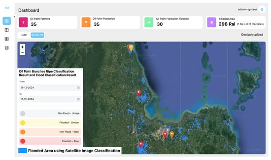 In addition to the previously mentioned application modules, an essential component is the dashboard processing and display module, which provides a summary of various relevant data to present an overall view, as shown in Figure 15. This research introduces the dashboard in multiple formats, including a map, satellite map, and graphical displays with numerical values. These metrics include the following: Oil Palm Farmers, representing the number of farmers reporting flood-related information; Oil Palm Plantations, the total number of plantations with submitted data; Oil Palm Plantations Flooded, the number of plantations affected by floods during harvesting; and Flooded Area, indicating the size or number of plantations affected by flooding. The map display is available in two formats: an online map and a satellite map. Both formats show the geographic coordinates of oil palm plantations using color-coded markers: gray markers for Non-Flood Unripe plantations and red markers for Flooded Ripe plantations. All markers are overlaid with flooded area data obtained from satellite image processing, represented by clusters of blue pixels, to verify and confirm flood conditions. For example, when a red marker is overlaid on blue pixels, the presence of blue pixels beneath the marker confirms that the plantation is indeed flooded. Similarly, yellow markers, which represent flooded plantations, also overlap with blue pixels. However, in the case of yellow markers, the plantations are not impacted during harvesting as the oil palm bunches are not yet ripe. Conversely, gray and orange markers represent non-flooded plantations. The blue pixel clusters on the map signify flooded areas identified through satellite image classification.