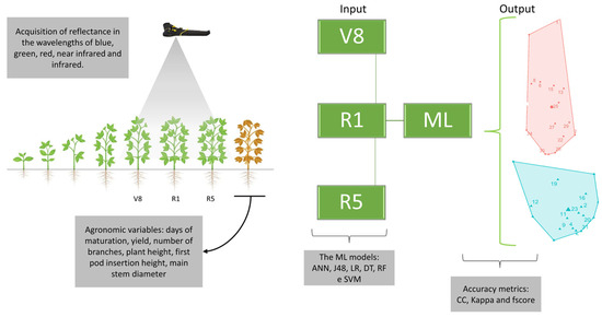 Machine learning (ML) methods have been used successfully to process remote sensing data [3]. Among the crops studied, soybean (Glycine max (L.) Merrill) has presented challenges due to its genotypic diversity and differences in cultivation areas worldwide [9]. The decision tree, random forest, multivariate regression, association rule mining, and artificial neural network models are among the most widely used to predict crop yield using spectral information as input variables. However, achieving satisfactory prediction accuracy in soybean has been a challenge. Besides the genetic differences between the materials, the different phenological stages, the environmental conditions of climate and soil [3], and the interaction between them are complex factors that can interfere with the accuracy of the models. In this way, assessing the accuracy of yield prediction over different crop stages can help minimize the effects of genotypes, the environment, and their interaction in the process of associating input variables (spectral information) and output variables (productivity) by ML models. This work aimed to evaluate the best ML and input configurations in the classification of agronomic variables at different phenological stages.