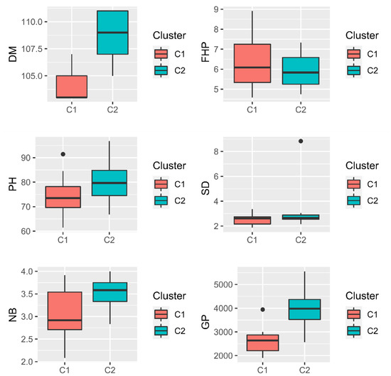 Boxplot with the means of each cluster formed for the agronomic variables days to maturity (DM), first pod height (FPH, cm), plant height (PH, cm), main stem diameter (SD, cm), number of branches (NB), and grain yield (GP, kg ha−1) evaluated in 32 soybean genotypes.