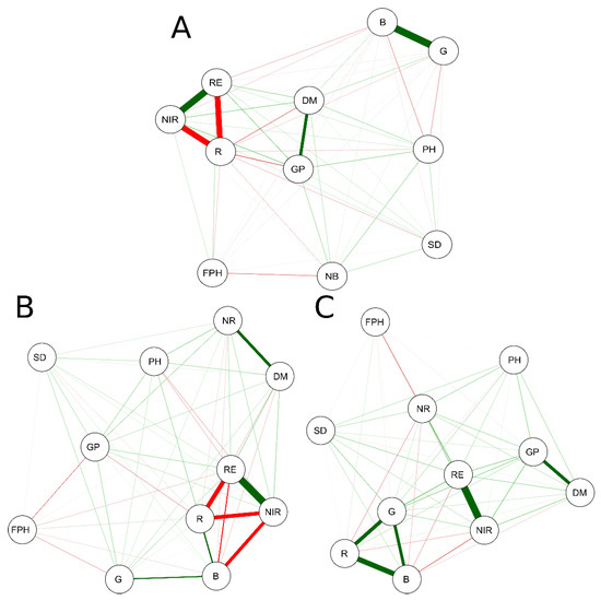 Correlation network between the agronomic variables days to maturity (DM), grain yield (GP), number of branches (NB), plant height (PH), first pod height (FHP), main stem diameter (SD), and the spectral bands wavelengths of blue (450 nm), green (550 nm), red (660 nm), red edge (735 nm), and near-infrared (790 nm) for the three evaluation periods (V8 (A), R1 (B), and R5 (C)). Green and red lines indicate positive and negative correlations, respectively. The magnitude of these relationships is indicated by the thickness of the lines, in which thicker lines represent correlations above 0.60.