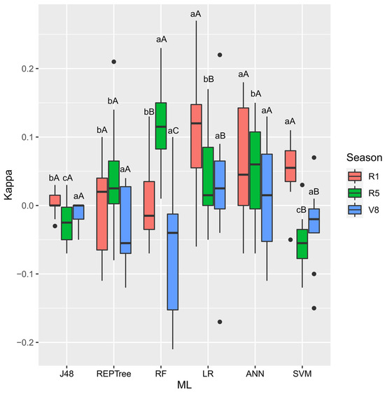 Boxplot for Kappa coefficient for significant interaction between machine learning models and tested inputs. Means followed by the same uppercase letters for the different inputs and the same lowercase letters for the different ML algorithms do not differ by the Scott–Knott test at 5% probability.