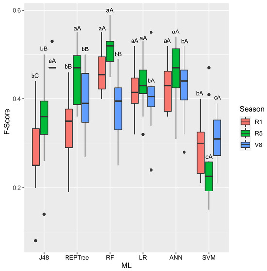 Boxplot for F-score for significant interaction between machine learning models and tested inputs. The means followed by the same uppercase letters for the different inputs and the same lowercase letters for the different ML algorithms do not differ by the Scott–Knott test at 5% probability.