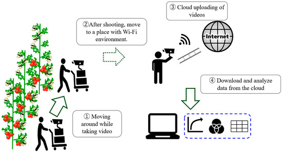 Various approaches have been used in the technology and research related to tomato harvest predictions. For example, spectral images captured by a spectral camera have been analyzed using machine learning [1], and images have been analyzed using a machine learning Mask-CNN (Convolution Neural Network) to accurately determine the fruit-bunch condition and identify the differences in RGB [2,3]. Although these related studies have used methods to determine the degree of ripeness based on the color of tomatoes by identifying the RGB values of the captured images, it remains challenging to accurately identify images due to varying light conditions inside a facility. On the other hand, a method has been proposed to correct the discrepancy based on the average number of days of harvest by quantitatively analyzing data such as total temperature, sunshine hours, and CO2 concentration, which growers have conventionally used to predict the harvest [4]. In related research, it is necessary to obtain data on many conditions, such as when sudden temperature changes occur or when it is difficult to obtain data on the growing environment, which is a significant hurdle in practical applications.