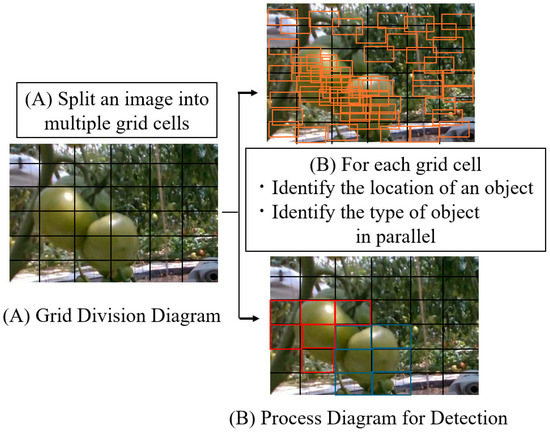 Figure 4 illustrates the detection process using YOLO. The input image is divided into an N × N grid, as shown in Figure 4A. Subsequently, as shown in (B), each grid cell predicts the presence of an object in that cell. This includes the coordinates of the bounding box and the type of object. A confidence score was calculated for the bounding box predicted for each grid cell. This score represents the probability of the object being inside the box and its accuracy. Because multiple bounding boxes are predicted for the same object, the most reliable box is specified, and duplicate boxes are removed. The location of the detected object and its class label are finally outputted, as shown in Figure 5 [12,13,14]. YOLO has a low detection accuracy because false positives increase with low image quality or noise, as shown by the blue box in Figure 5 [11,15]. To improve the accuracy of tomato detection using YOLO, preprocessing such as resizing and random cropping based on the depth at the time of image capture is required, as well as optimizing pixels disturbed by moving speed and other factors. Annotation is also required to optimize the pixels disturbed by moving speed and other factors. Thus, it is necessary to solve the detection accuracy problem for operational applications.