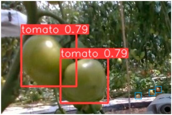 The accuracy of the tomato detection method constructed using YOLO was confirmed. During the experiment, a camera was mounted on the cart, with the view angle directed toward the bottom of the cart. The time required for each row was approximately 1 and 30 s to 2 min. Figure 8 shows how YOLO detects tomatoes within the range of the view angle during the actual shooting. To avoid duplicate detections of the same tomatoes, tracking was performed to avoid quantity errors [34]. In other issues, the tomatoes circled in red in Figure 8 were excluded from harvesting in another row (the row in the back). The excluded tomatoes were also included in the quantification, which resulted in errors. Therefore, a threshold was set to exclude those with small bounding boxes, and the tomato boxes on the far side were adjusted so that they could not be detected [35].