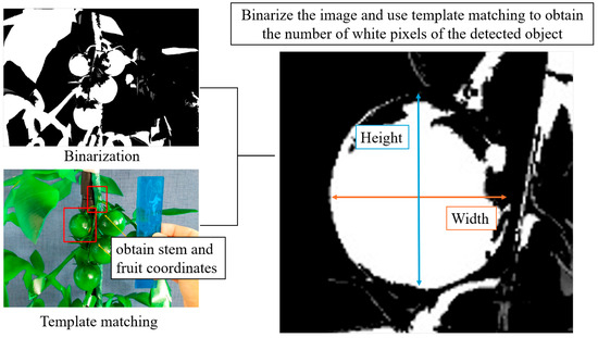 Template matching is a simple method for size measurement. Related research in template matching includes implementing a multi-scale template matching method on Graphics Processing Units (GPUs) to reduce computation time [16], utilizing GoogLeNet to improve computation speed [17], and devising a new similarity measure between templates and images, Global-Aware Diversity (GAD), to improve matching accuracy [18]. GAD is a new similarity measure between templates and images that improves matching accuracy [19]. These are studies on improving the performance and application of template matching technology, and methods and knowledge applicable to crop size measurements are also provided. As a concrete example, as shown in Figure 6, there is a method to extract the edges of an image obtained from binarization and template matching and measure the size based on the length and width of the edges. The shape of a tomato was recognized from the binarized image by template matching. The length and width of the tomato fruit and the thickness of the stem were calculated by counting the number of pixels in the white image. In other words, the size of a tomato can be determined by counting the number of pixels and comparing them using a ruler. However, setting up a yardstick within the angle of view was necessary to measure the actual size. The actual size of an object was known. Thus, the size of a pixel was calculated from the number of pixels in the object. The size was then multiplied by the number of pixels in the tomato area, as determined by binarization, to calculate the size. This requires the use of a yardstick. Table 1 compares the actual measured sizes and the sizes analyzed using template matching. Compared to the actual measurements, the measurement results were highly accurate, with an error rate of less than 10%. However, this method is impractical because it requires constantly installing a yardstick for operational purposes.