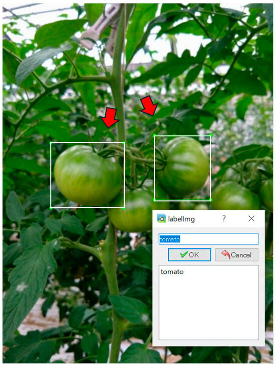 As mentioned previously, YOLO was used to detect tomatoes. To set up the system, we installed libraries such as ultralytics, opencv-python, and numpy in a Python 3.9 environment. After that, we created our own training data for a dedicated tomato detection model. The process of creating training data consists of preparing tomato images and labeling them with annotations. In this study, we used the labelImg tool for annotation. After all images have been labeled, training was performed. The dataset for training is divided into training and test datasets, and the configuration information is described in the data.yaml file. Next, we describe the preprocessing and training parameters. The image data used in YOLO were actual images captured in the field. First, multiple images of the object to be detected were prepared. In this study, 1166 images were obtained. To enhance detection accuracy even in the case of overlapping objects, low pixel counts, blurred objects, or overlapping leaves, as shown in Figure 5, we prepared images in various states. Next, as shown in Figure 7, the objects to be detected are surrounded by red arrows in the image and labeled with annotations. In this study, only tomatoes were annotated to detect tomatoes because the model was intended for tomato detection. The class label, in this case, was “tomato”. After all images were annotated, the last step was training. The training parameters were set to 315 test images, 100 training cycles, and a batch size of 32. Because it is common for the number of test images to be 2–30% of the number of training images, we set the number of test images to 315, which is approximately 30% of the 1166 images. The number of training sessions was set as 100 to avoid overtraining. The batch size was set to 32 [32,33].