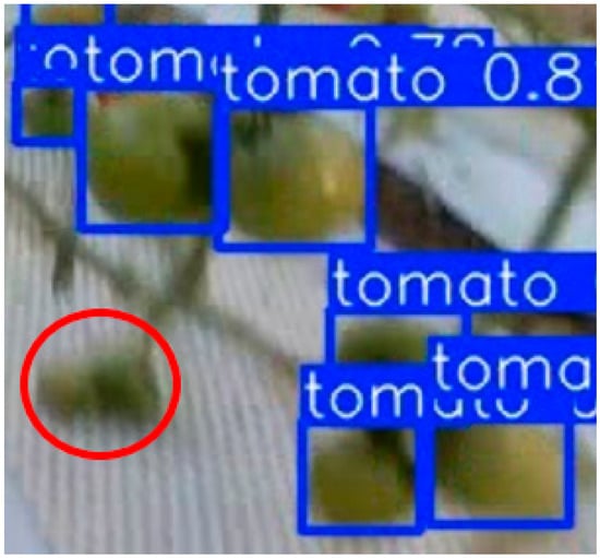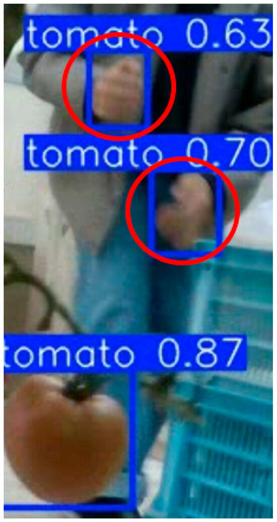 Table 2 shows these results. The correct response rate was 0.99, and the detection rate was 0.88. Figure 9 and Figure 10 show the false positive and negative detections. The areas circled in red in Figure 9 are false detections, and the possible causes include the similarity in shape to tomatoes and the presence of unexpected objects that were originally projected. Figure 10 shows that the area circled in red is undetected, possibly because YOLO is not good at detecting small objects, and small objects are undetected. Other possible reasons include that the slight decrease in the detection rate is thought to be because the leaves were almost completely hidden, making it difficult to detect them.