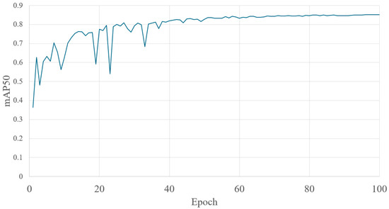 The mean Average Precision (mAP) was used to evaluate the performance of the object detection models [37]. mAP was calculated from the Average Precision (AP), which was obtained by integrating the curve of a graph plotting the percentage of correct responses on the vertical axis and the detection rate on the horizontal axis. If r is the value of Recall and Precision(r) as the corresponding accuracy rate, the AP is expressed by Equation (3). The mAP is obtained by averaging the AP by the label class. If C is the number of label classes and is the value of AP for label class i, mAP is expressed by Equation (4). The Intersection over Union (IoU) measures the degree of agreement between the predicted region and the correct region and is expressed on a scale from 0 to 1. The closer the value is to 1, the more accurate the prediction. mAP50 is an index that sets the threshold value to 0.5 or higher. Figure 11 shows a graph of the mAP50 for the results of this study. Figure 11 shows that mAP50 increased as training progressed. This indicated that the accuracy of the detection model improved with repeated training. As a mAP of 80% or higher is generally recognized as having sufficient accuracy [11,38], the discrimination accuracy of this training model is high.