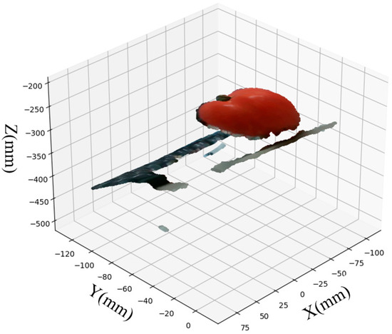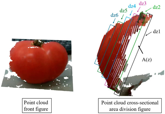 To measure the volume, the half surface of a tomato was obtained as a point cloud, as shown in Figure 16, and the calculation was performed by integrating the cross-sectional area of the point cloud of the half surface [46]. The left image in Figure 16 shows the front view of the point cloud and color image, and the right image shows the side view of the point cloud. The volume of the entire tomato was calculated by dividing the tomato point cloud into multiple cross-sections by depth, as shown on the right, integrating the cross-sections, and doubling them, assuming the backside of the tomato. If the xy coordinates of the edge points are and , the cross-sectional area [] A(z) is expressed as shown in Equation (6). Using Equation (6) and assuming that the volume is V [] and the number of cross-sectional area divisions is N, the calculation equation is expressed as Equation (7).