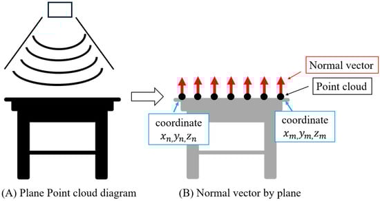 To measure the size, the normal vector of a point cloud was used to obtain the point cloud of the tomato edge area. Figure 13 and Figure 14 show that the normal vector indicates the direction perpendicular to the surface at a point on a certain plane or curved surface [41,42,43]. When measurements are taken on a horizontal surface, such as a desk, as shown in Figure 13A, the points appear on a plane, as shown in Figure 13B, and the normal vector is perpendicular to the plane. Thus, they all point in the same direction. Figure 14 shows the results for the curved surface. When measuring a curved surface such as a tomato, as shown in Figure 14A, a point cloud appeared on the surface, as shown in Figure 14B. The normal vector is perpendicular to each point cloud on the surface. Therefore, the direction varies from place to place.