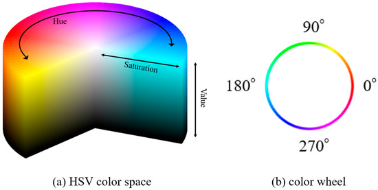 The HSV color space is a color model comprising hue, saturation, and value/brightness. When the light intensity, saturation, and lightness change, the hue is hardly affected by the light intensity, making it possible to obtain true colors [47,48,49,50]. As shown in Figure 18b, the hue represents a hue ring; therefore, the RGB values can be expressed by the angle of the hue ring.