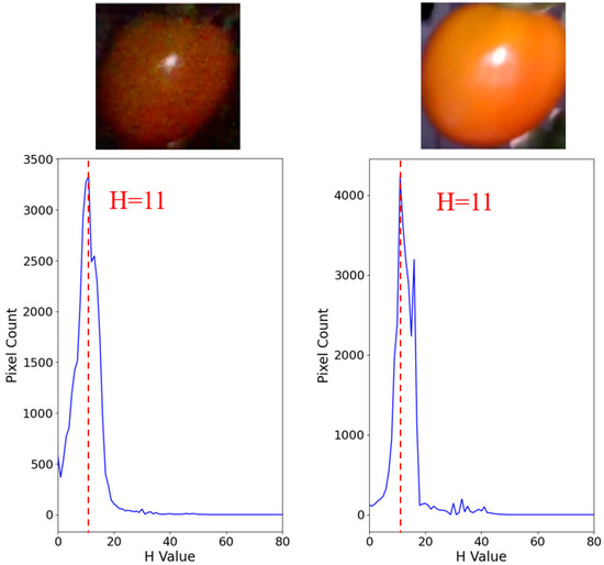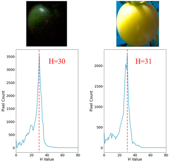 For example, the red pixel in Figure 19 is three in the dark and zero in light. The orange color in Figure 20 is 11 under both dark and light conditions. Green in Figure 21 has a hue value of 30 in the light and 31 in the dark, and all colors have approximately the same hue value, regardless of the light or dark changes. Applying the hue values of each color to the color thresholds in Table 7 we observe that the hue values in Figure 19 are 3 and 0, which correspond to the 0–6 range for red, and thus are assumed to be red. Figure 20 shows that the hue value is 11, corresponding to 11–15 for orange. Figure 21 shows that the hue values are 30 and 31, corresponding to light green to yellow green, and thus, estimated to be in the light green to yellow-green stage.