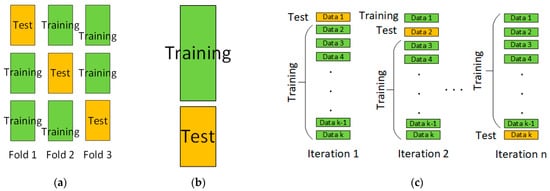 Cross-validation methods—general view. (a) k-Fold; (b) Hold-Out; (c) Leave-One-Out.
