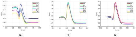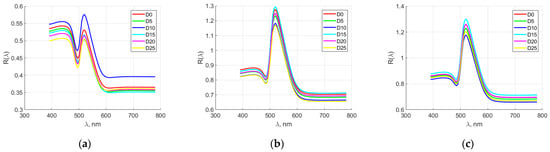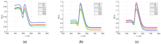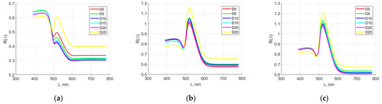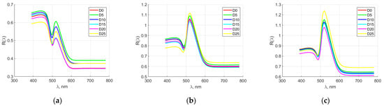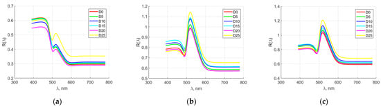 The spectral characteristics were obtained after converting the values from the XYZ and LMS models into reflectance spectra in the VIS region, in the range 390–730 nm. These calculations are for observer 2° and illuminance D65.