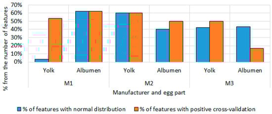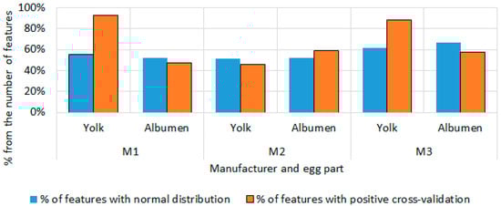 This paper concerns the methods and algorithms developed for tracking changes in the internal characteristics of eggs during storage that emphasize rapid and simple classification and satisfactory regression accuracy, considering technological requirements. A thorough analysis was carried out for 53 characteristics of yolk, thick albumen, and thin albumen, followed by feature selection using the most informative features. Among others, three feature selection methods (FSRNCA, SFCPP, and RReliefF) gave comparably good results and allowed for the identification of the most important features. The results show that with features selected from data across three different manufacturers of hen eggs, more features gave positive cross-validation results and normal distribution checks in each storage stage. This infers that yolk characteristics are more stable and predictable than albumen characteristics. The study also identifies that the numbers and informativeness of selected features of yolk and albumen for hen eggs exceed those for quail eggs, including for cross-validation. Quail eggs give very varied results depending on the producer. Over 60% of the selected albumen features for manufacturers M1 and M2 showed strong performance in both normal distribution checks and cross-validation at different storage stages, while for producer M3, only 17% of features met these criteria. Among the yolk features selected for producers M2 and M3, more than half showed positive outcomes from normal distribution to cross-validation. For producer M1, only 4% of the yolk features passed these criteria at all storage stages. These results highlight the feature stability and predictability variation across different types of eggs and their manufacturers.