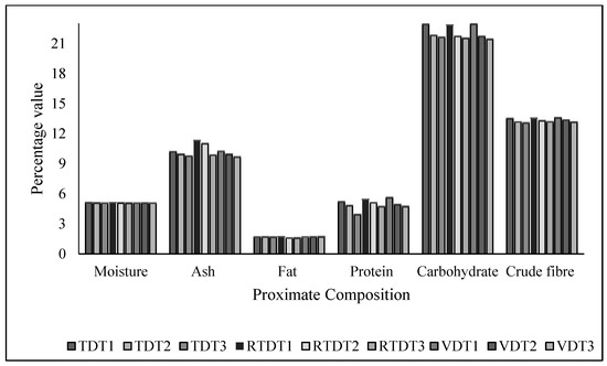 Proximate composition of fresh and dried thyme using tray dryer, recirculating tray dryer, and vacuum dryer, where TDT1 = Tray drying at 35 °C; TDT2 = Tray drying at 40 °C; TDT3 = Tray drying at 45 °C; RTDT1 = Recirculating Tray drying at 35 °C; RTDT2 = Recirculating Tray drying at 40 °C; RTDT3 = Recirculating Tray drying at 45 °C; VDT1 = Vacuum drying at 35 °C; VDT2 = Vacuum drying at 40 °C; and VDT3 = Vacuum drying at 45 °C.