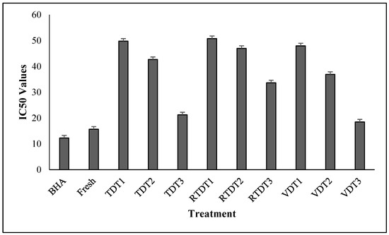 IC50 values of fresh and dried thyme using tray dryer, recirculating tray dryer, and vacuum dryer. Where: Fresh = Freshly harvested thyme; TDT1 = Tray drying at 35 °C; TDT2 = Tray drying at 40 °C; TDT3 = Tray drying at 45 °C; RTDT1 = Recirculating Tray drying at 35 °C; RTDT2 = Recirculating Tray drying at 40 °C; RTDT3 = Recirculating Tray drying at 45 °C; VDT1 = Vacuum drying at 35 °C; VDT2 = Vacuum drying at 40 °C; and VDT3 = Vacuum drying at 45 °C.