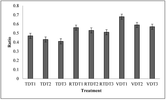Volume expansion ratio of dried thyme powder using tray dryer, recirculating tray dryer, and vacuum dryer. Where: TDT1 = Tray drying at 35 °C; TDT2 = Tray drying at 40 °C; TDT3 = Tray drying at 45 °C; RTDT1 = Recirculating Tray drying at 35 °C; RTDT2 = Recirculating Tray drying at 40 °C; RTDT3 = Recirculating Tray drying at 45 °C; VDT1 = Vacuum drying at 35 °C; VDT2 = Vacuum drying at 40 °C; and VDT3 = Vacuum drying at 45 °C.