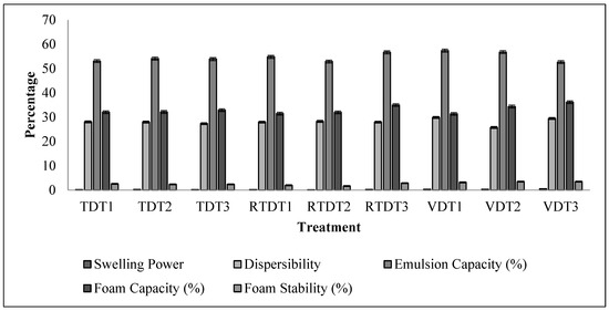 The variables that influence and determine a sample’s capacity to create an emulsion include its chemical composition, concentration of active compounds, powder particle size, and processing conditions. Herbs contain naturally occurring emulsifiers including proteins, polysaccharides, and phospholipids that assist in maintaining the stability of the emulsions. The amphiphilic properties of saponins, found in thyme, aid in emulsification. Furthermore, thyme’s essential oils, especially thymol and carvacrol, help to stabilize emulsions. These substances can help emulsions to develop by lowering the surface tension between the water and oil phases. This is why the emulsion capacity for RTDT1 was 52.72%, rising to 54.32% for RTDT2, and 56.53% for RTDT3. VDT had a comparable emulsion capacity. The VDT1 emulsion capacity was 52.94%, while that of VDT3 was 50.27%. Due to the presence of natural emulsifiers, several plants, including aloe vera, chamomile, and lavender, are well recognized for their high emulsion capacity capabilities. The particle size distribution in the emulsion’s dispersed phase is influenced by the emulsion capacity. Smaller and more uniform droplets result from a higher emulsion capacity, which may have an impact on the emulsion’s texture and appearance [40].