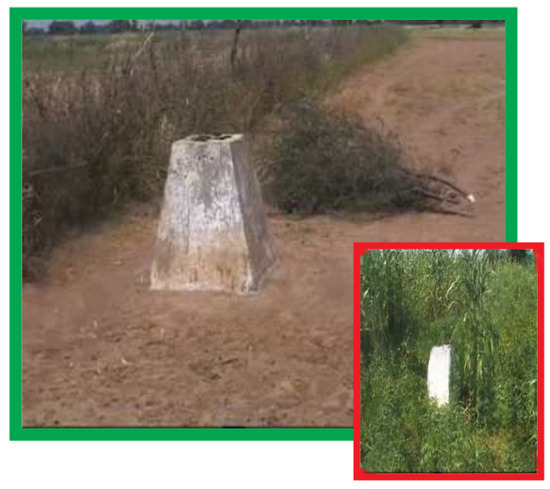 Photo of a concrete block delimiting a transhumance corridor. As shown in the bottom right-hand corner, sometimes these concrete blocks are less visible in rainy seasons due to vegetation.