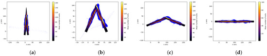 Time evolution of the herd over two corridors. The bold line in the centre of the route represents the herder path. Blue lines correspond to the paths of the cows. We highlight the exit point of cows with a red point. We fix , , and the width is 10 m. In the sub-figures, if is the angle (in degrees) between corridors, then other parameters are (a) , (b) , (c) , (d) .