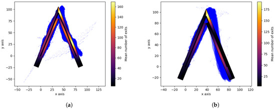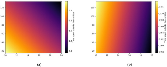 In these two figures, we simulate n different scenarios with different corridor widths (in the axis) and angles (in the axis) to represent exit rate in function to widths and angles. In the sub-figures, we fixed (a) , and (b) .