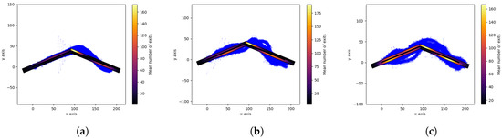 Using the model developed in Section 2.2, we can simulate the displacement of the herd. See Figure 5 for a first hint in this way. Specifically, if the herder moves too quickly or the cows are too disorganized, then there are significant and frequent deviations in their trajectories (Figure 6). To make better use of these simulations, we repeat the model 50 times and evaluate the herd’s behaviour on the basis of two different functionals. In Section 3.2.1, we study the mean distance to the herder, and in Section 3.2.2, we study more precisely the exit rates. As detailed below, our objective is to analyse the impact of the geometric properties of the corridors on path exits.