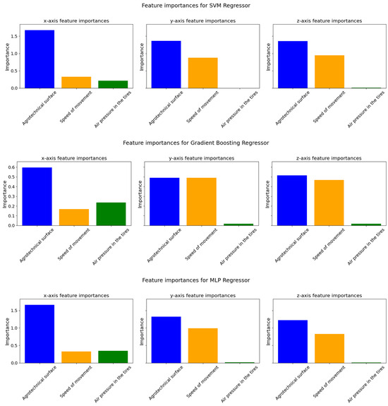 - The most important input features for predicting whole-body vibrations across all three axes are, in order, agrotechnical surface, the speed of movement, and air pressure in the tires.