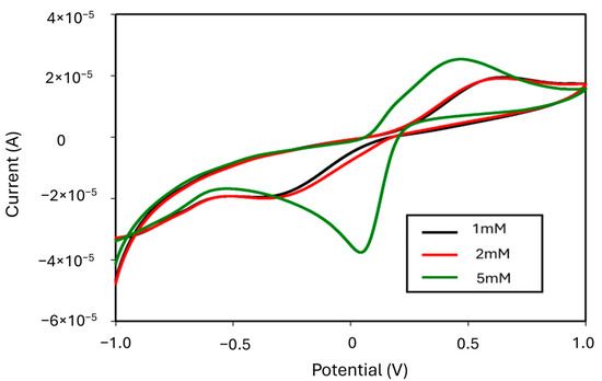 Here, three different concentrations of ferri–ferro ranging between 1, 2, and 5 mM were chosen. By applying a constant voltage of −1 to 1 V, the oxidation peak for each concentration was obtained. It is evident from
